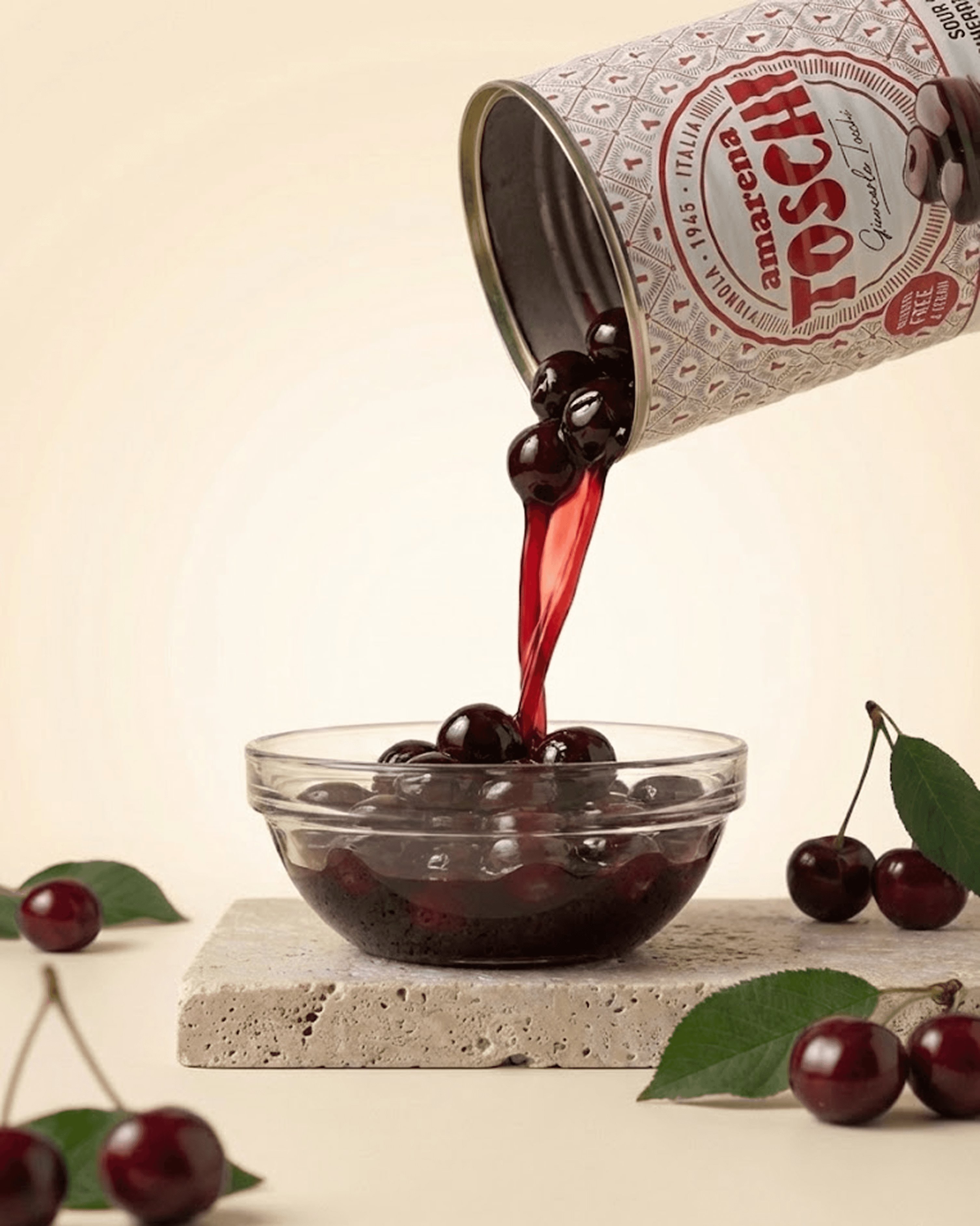 Amarena cherries are the fruit of the Prunus cerasus tree which originated in Asia Minor and were brought to Italy by the Roman General Lucullus. The sour cherry is a variety of cherry with a tart, refreshing flavor. A summer fruit which is picked in July, high in vitamins A, B1, and C.