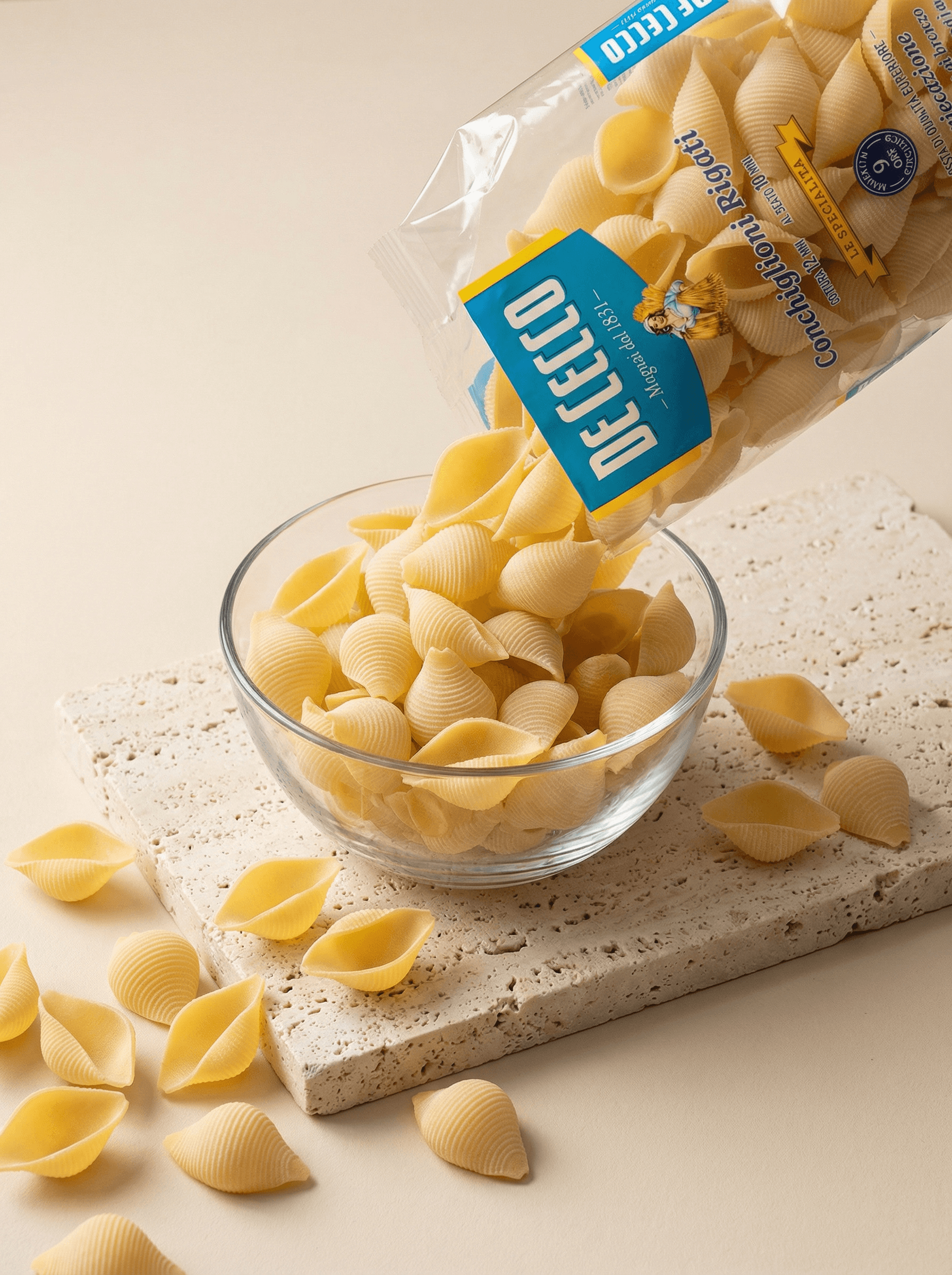 Conchiglioni Rigati, originally from Campania, their particular size and shell shape, perfect for holding sauces, make Conchiglioni an unbeatable pasta shape for baked dishes with fillings, whether with fish or meat sauces. Besides being baked and stuffed, they can also be enjoyed with fresh sauces, light and spring-like sauces, with fresh mozzarella, tomato, and basil.