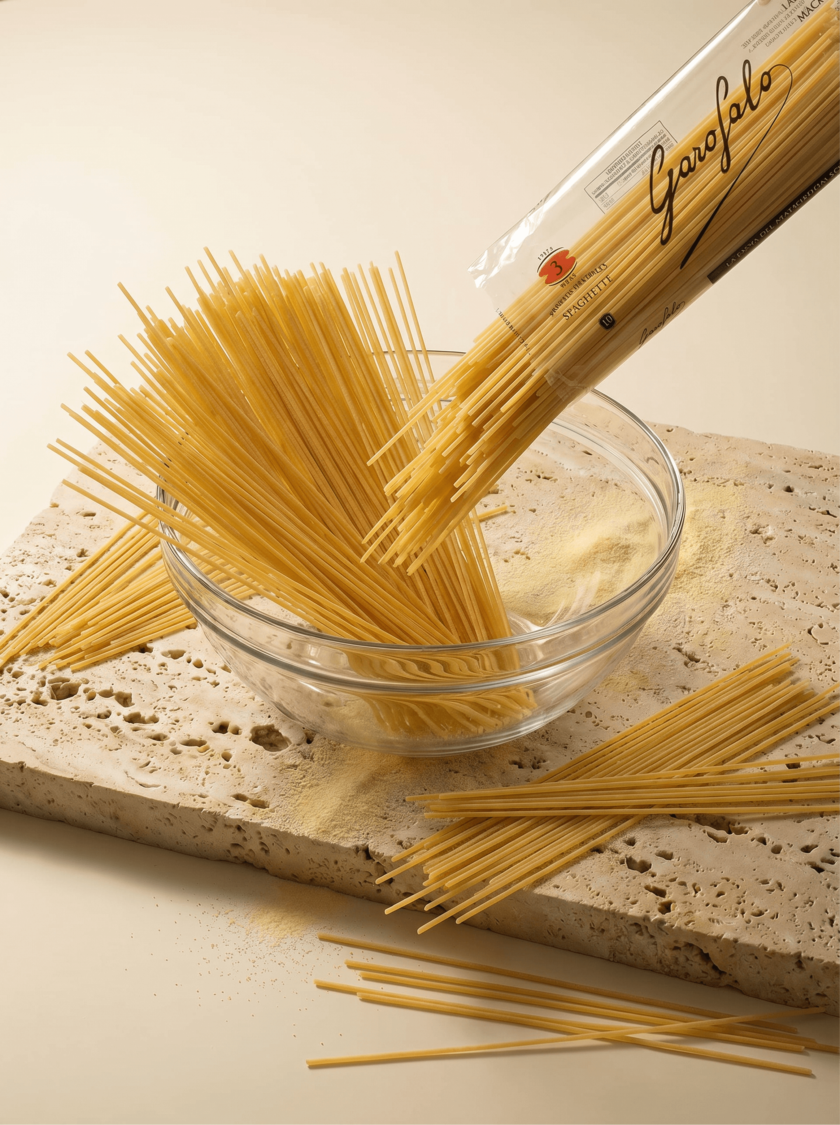Rough to the touch, thanks to the bronze drawing work, the Garofalo Spaghetti they hold the condiments perfectly. The shape is long and thin, the section round, the possible combinations infinite given the great versatility of this type of Gragnano PGI Pasta.
