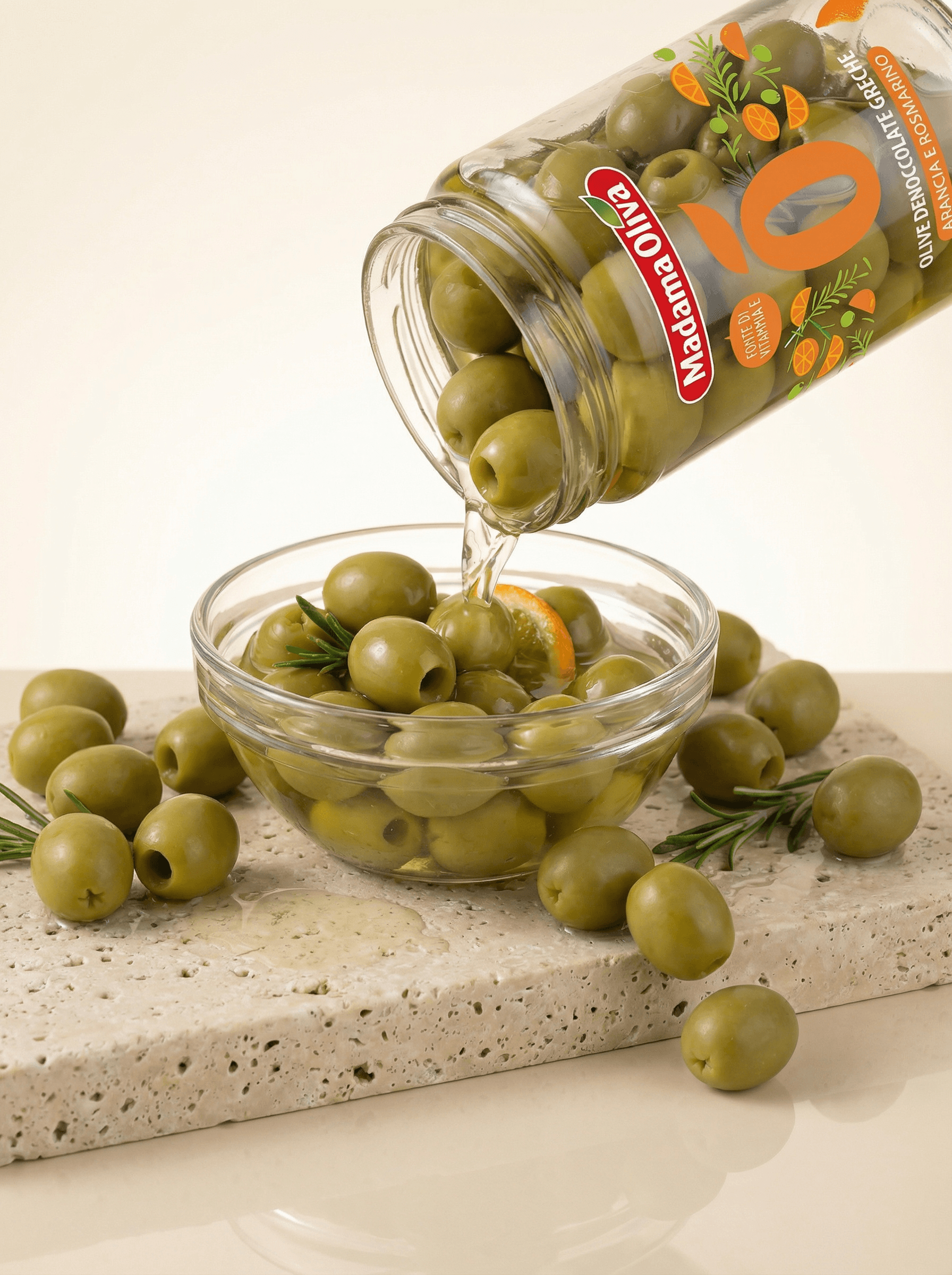 Precious Pitted Green Olives, with a sweet and fruity flavour, in brine with orange rind and rosemary. Three of the best loved Mediterranean flavours come together in a fragrant, unique and harmonious combination. Each mouthful takes you back to that seaside getaway.