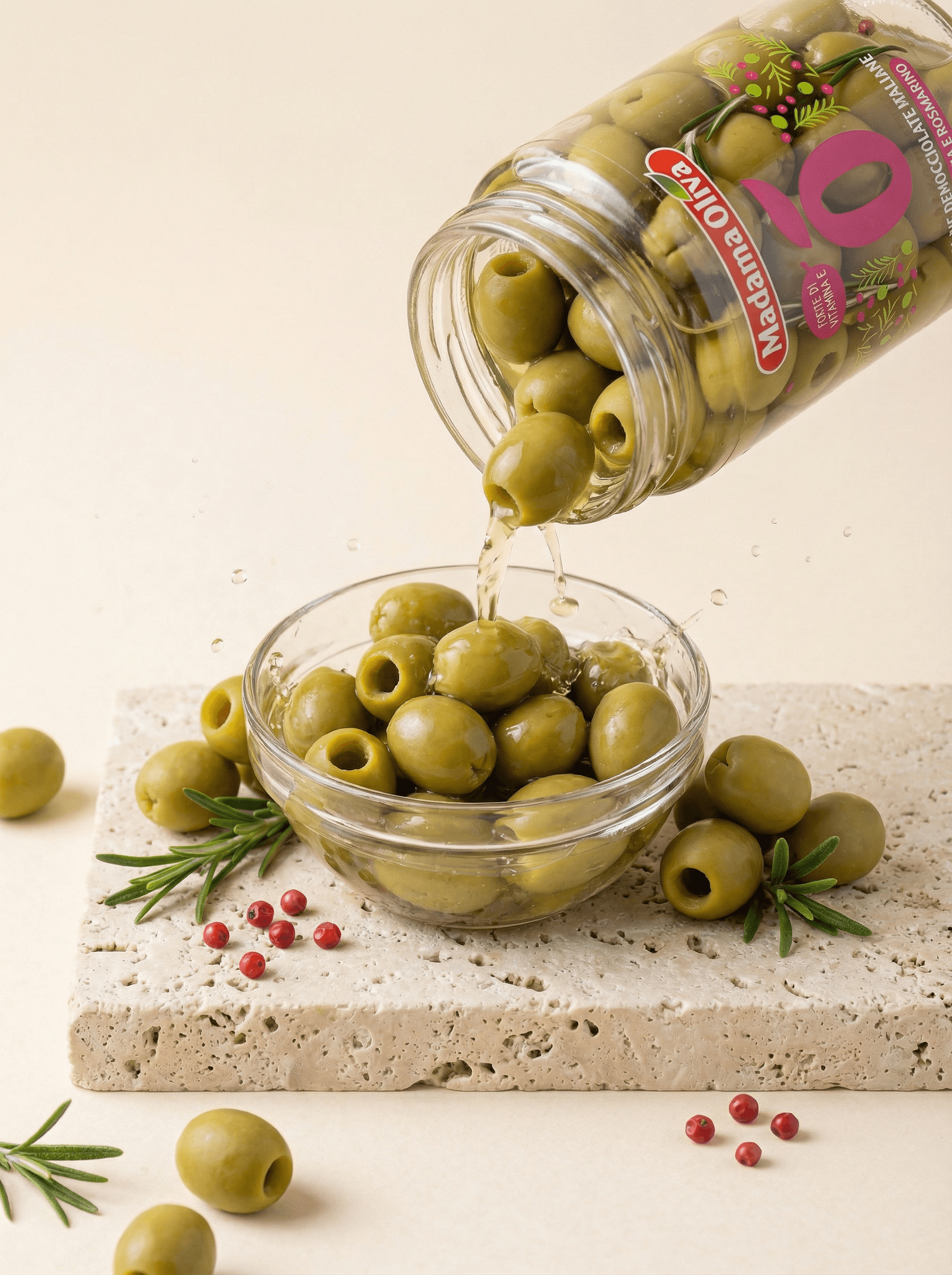 The delicate, slightly buttery flavour and mild bitter notes of the Castelvetrano Olives is enhanced by the spicy sweetness of pink peppercorn and rosemary. A bold and flavourful combination.