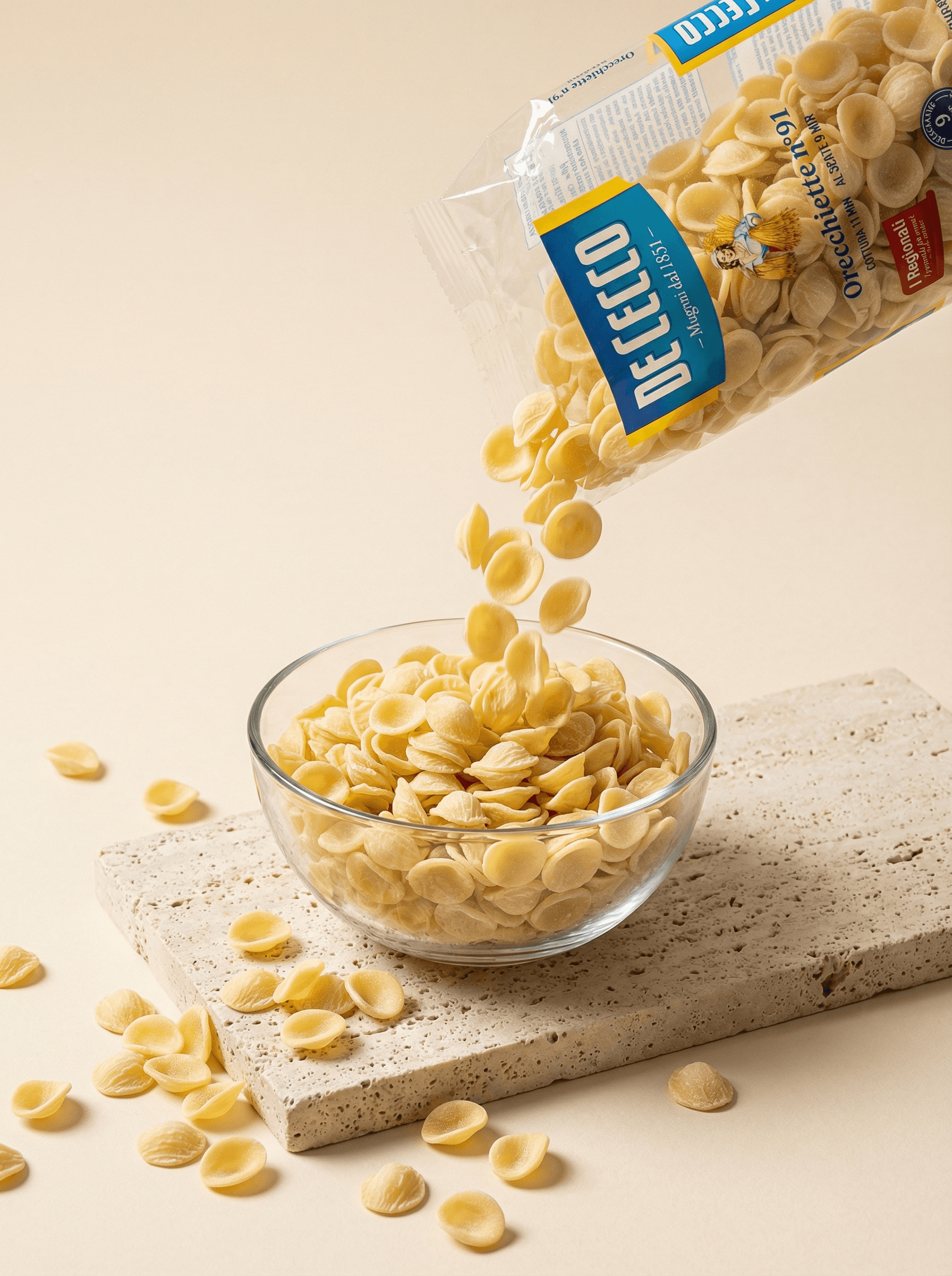 In the traditional Apulian method of making homemade pasta, orecchiette were made with white flour, durum wheat semolina, and water. Small pieces of dough were then "dragged" with the tip of a knife to create a kind of shell shape, then flipped backwards with the tip of the thumb. In the traditional Apulian recipe, orecchiette are boiled together with broccoli or potatoes and served with a tomato sauce and pecorino cheese, or with garlic and oil. They are also known as "Recchie" and are sometimes served with vegetable ragù or lamb and ricotta ragù.