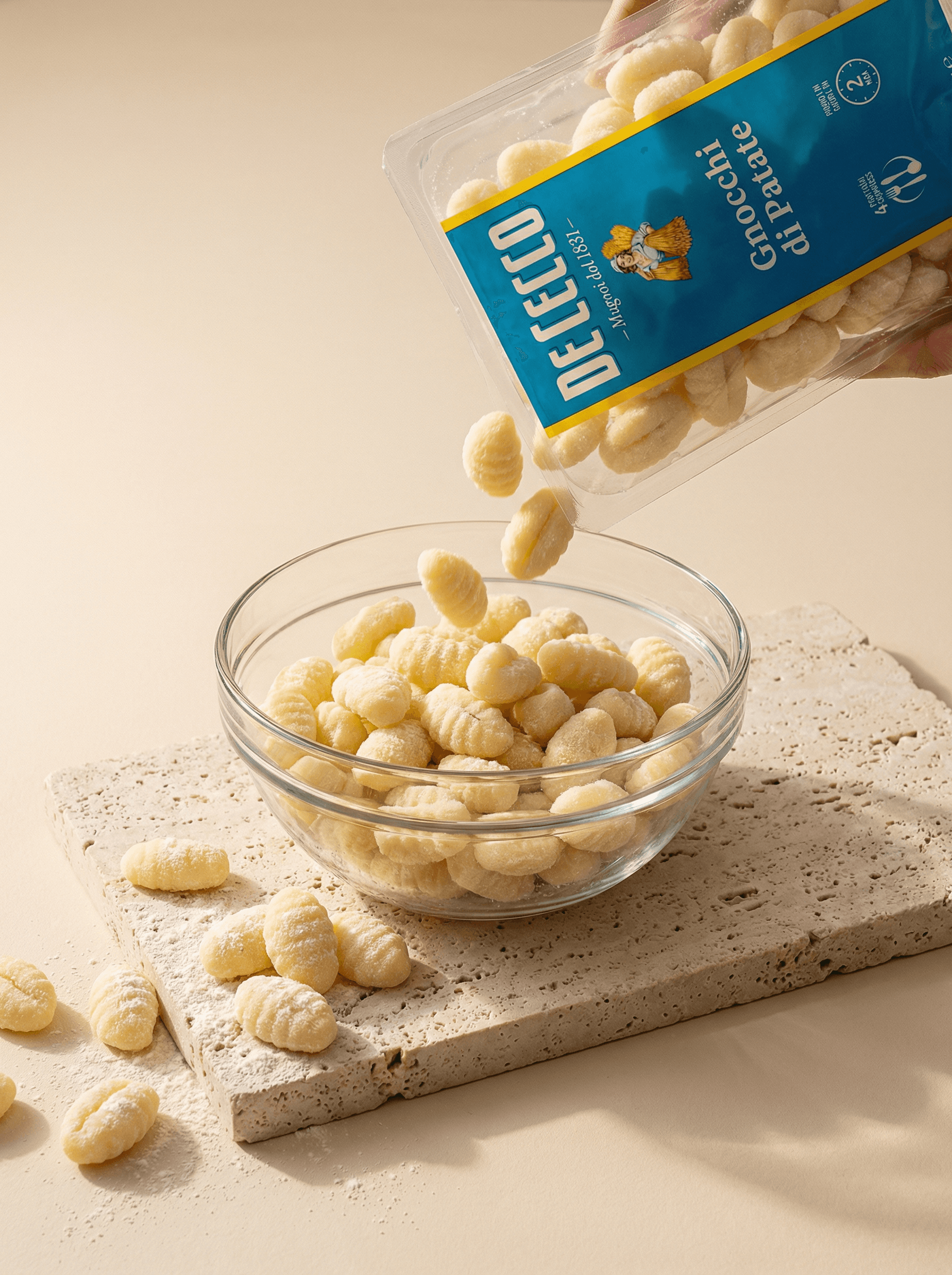 The exclusive De Cecco recipe is enhanced by its substantial use of fresh potato (80%), which makes the gnocchi softer with a strong potato flavour. Match it with a traditional meat ragù or a more creative option such as pesto made with chards, pine nuts and ginger – it’s up to you!
