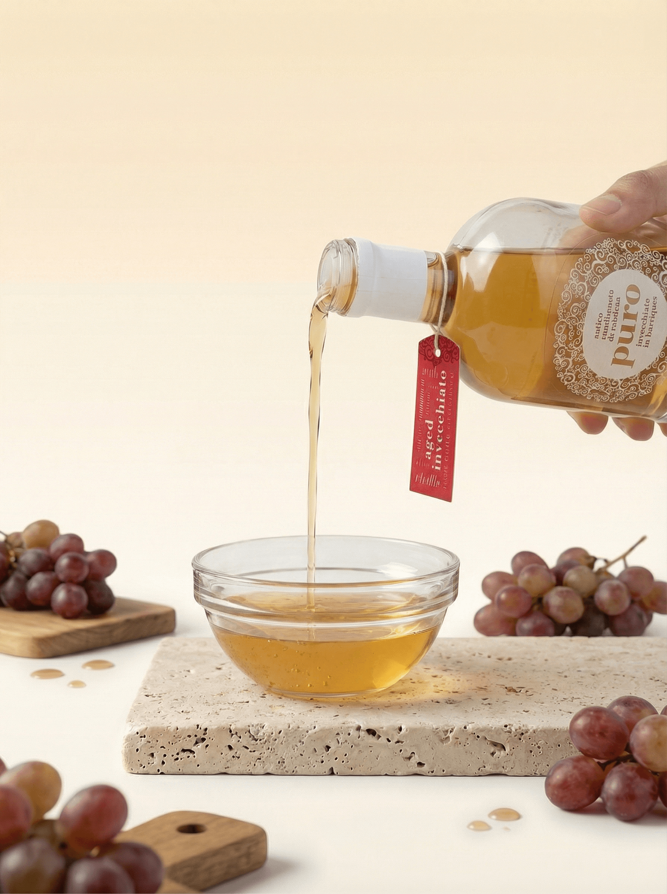 Sweet, dense and full-bodied, low acidity (4%) Fruity and fresh at taste, with a pale yellow and brillant colour. Suggestion of use: vinegrette, fresh cheese such as goat’s cheese or mozzarella, carpaccio and fish marinades.